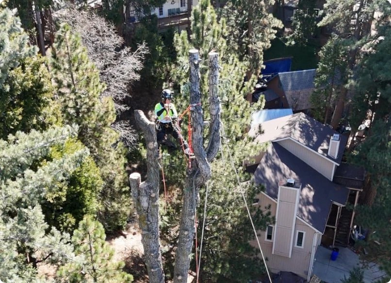 In this project, our team carried out a complete tree removal operation on a tall, decaying pine located near residential properties in Lake Arrowhead, California.